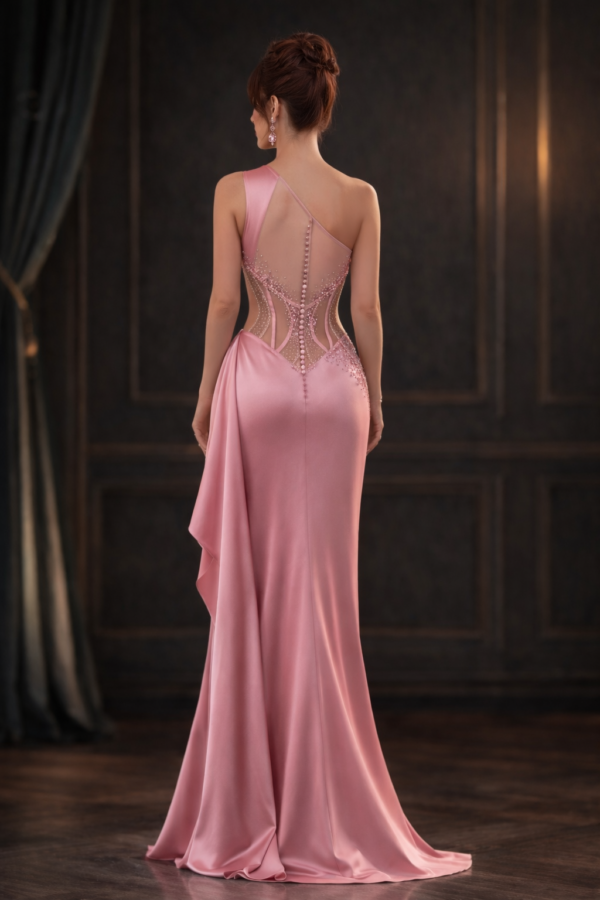 This blush pink satin gown features a one-shoulder neckline paired with a structured illusion corset bodice that visually enhances the waist while creating a longer, refined torso line. Delicate micro-crystal embellishments trace vertical contours through the mesh panels, offering subtle sparkle without overpowering the design.