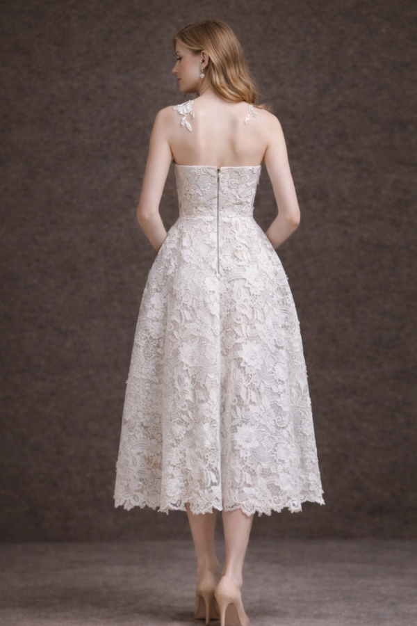 This is a dress that feels both delicate and confident — classic from the front, graceful from the back.