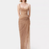 The skirt flows in sheer champagne tulle, softly wrapped and gathered at the hip for a sculptural drape effect. The translucent overlay reveals a lace underlayer beneath, giving the gown dimension and quiet shimmer under light.