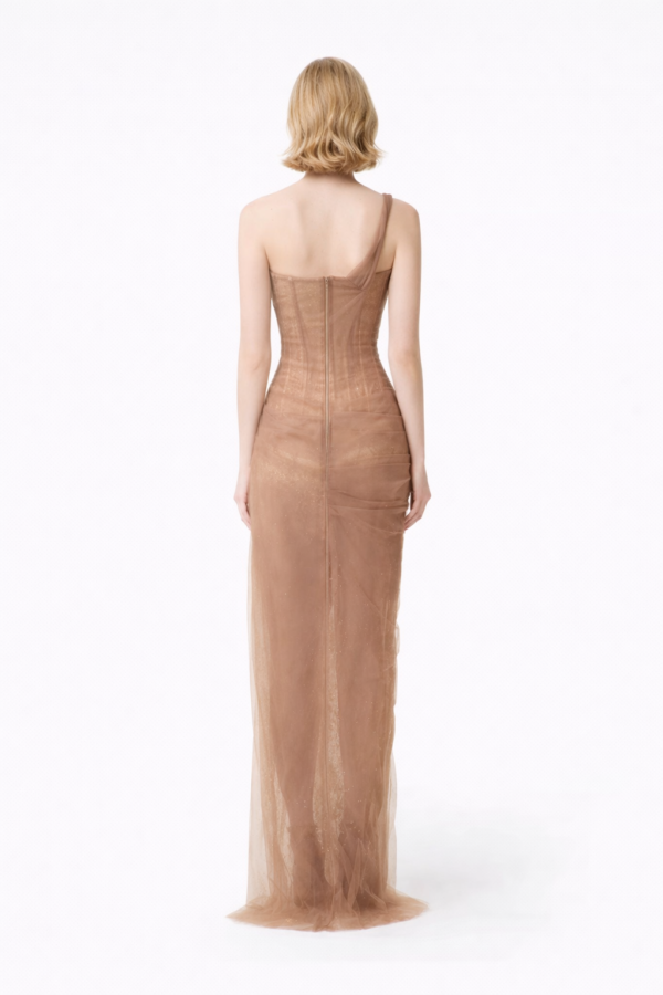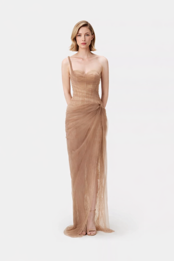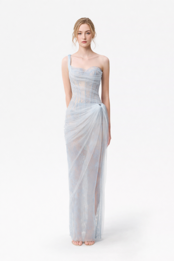 Thank you for reading this post, don't forget to subscribe!The fitted corset bodice features delicate boning and subtle lace layering, creating a contoured silhouette that enhances the waist while maintaining a romantic transparency. A single asymmetric strap adds modern tension to the classic sweetheart neckline.