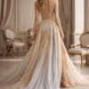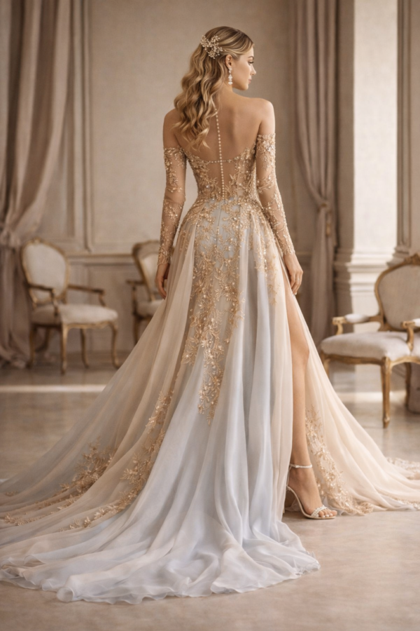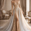 Thank you for reading this post, don't forget to subscribe!The Champagne Illusion Lace Couture Gown is the perfect balance of romantic elegance and modern sensuality. Designed with a sculpted illusion corset bodice, this gown features delicate champagne lace embroidery that appears to float effortlessly across sheer tulle, creating a breathtaking couture effect.