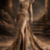 The gown flows into a sleek high-slit silhouette, revealing graceful movement with every step. A sweeping train trails behind like desert wind across ancient sands, creating a breathtaking presence worthy of a goddess of the Silk Road.
