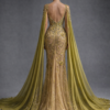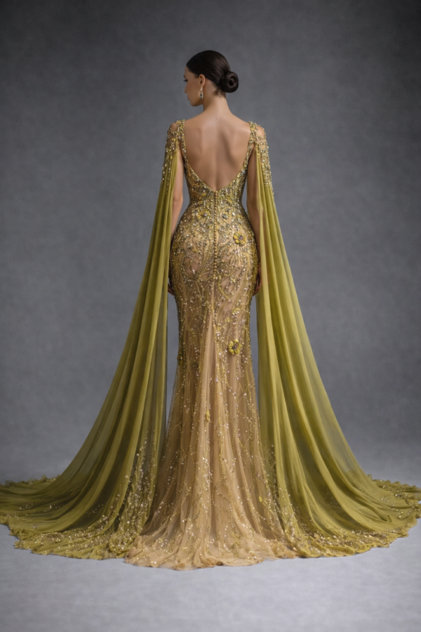 Attached at the shoulders, a pair of ethereal chiffon cape sleeves flows gracefully behind the wearer, creating a regal train that transforms every step into a cinematic moment. The soft emerald tone layered over nude illusion mesh gives the gown depth, luminosity, and couture-level sophistication.