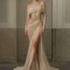 Thank you for reading this post, don't forget to subscribe!Crafted from delicate sheer mesh and flowing chiffon, this gown features a dramatic off-shoulder neckline that highlights the collarbone while sculpting the silhouette. The waistline is adorned with intricate hand-beaded crystal appliqué, creating a captivating illusion effect that enhances the body’s natural curves.