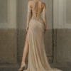 A bold asymmetrical draped skirt reveals a high slit, adding movement and allure, while the soft flowing train glides effortlessly behind with every step. The sheer long sleeves provide a subtle balance of mystery and elegance, making this gown perfect for red carpets, gala evenings, and high-fashion events.