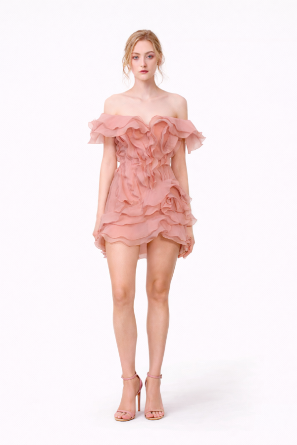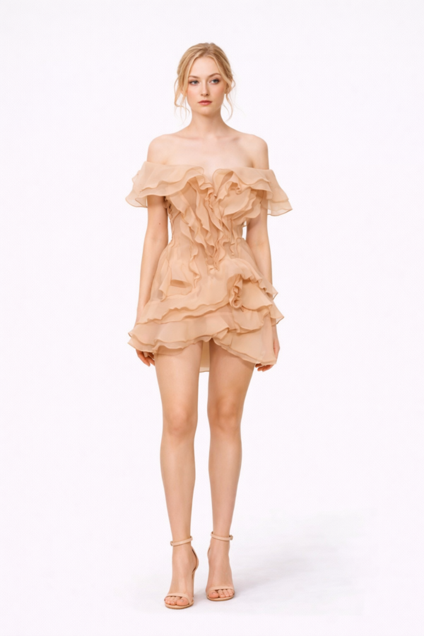 The Ivory Petal Ruffle Mini Dress is designed to feel like a floating bloom in motion. Crafted from airy organza, this off-the-shoulder silhouette features cascading layered ruffles that frame the neckline and flow down the bodice like delicate petals.