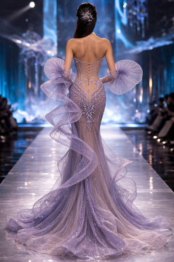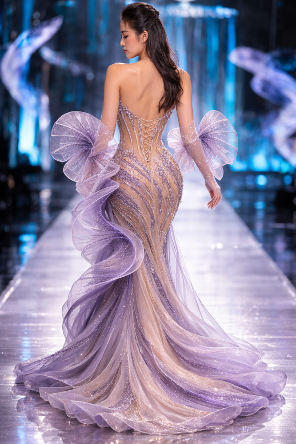 Thank you for reading this post, don't forget to subscribe!The dress features a stunning illusion corset bodice with visible boning, crafted from nude mesh that creates a sculpted hourglass shape. Hand-placed crystals and bead embroidery form a shimmering champagne-to-lavender gradient, highlighting the waistline and adding couture-level detail.