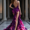 Magenta Ombre Ruffled Couture Gown – Deep Plunge Evening Dress with High Slit, Luxury Gradient Pink Purple Formal Dress
