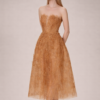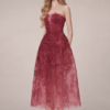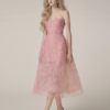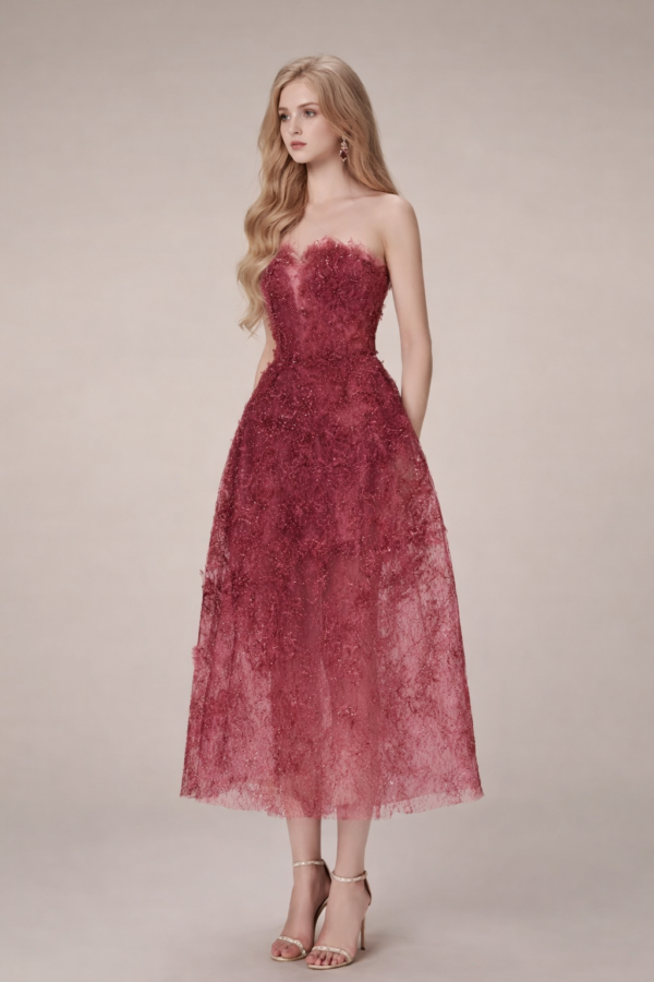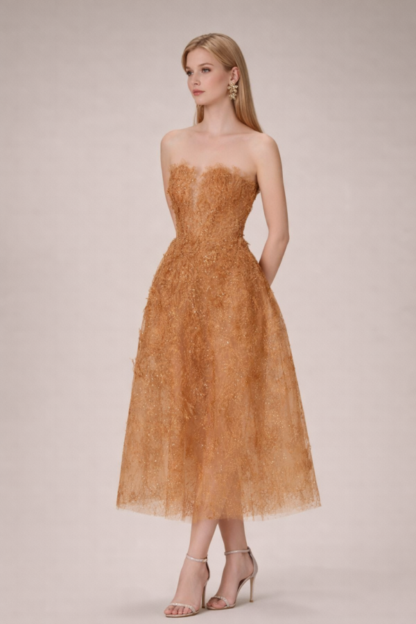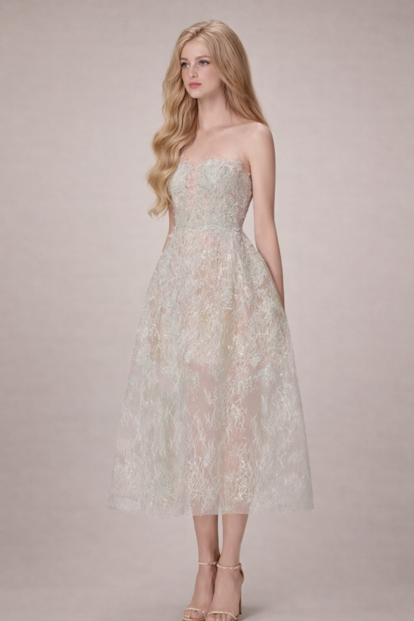 This strapless midi silhouette features a softly structured bodice with delicate sweetheart shaping, designed to sculpt and flatter the neckline. The entire dress is layered in intricate floral lace embroidery with subtle shimmer woven throughout, creating a refined glow under natural light.