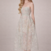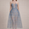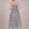 A voluminous A-line skirt falls gracefully below the knee, with sheer tulle overlay adding depth and dimension. The semi-transparent layering reveals a soft blush undertone, giving the piece a dreamy, ethereal finish.
