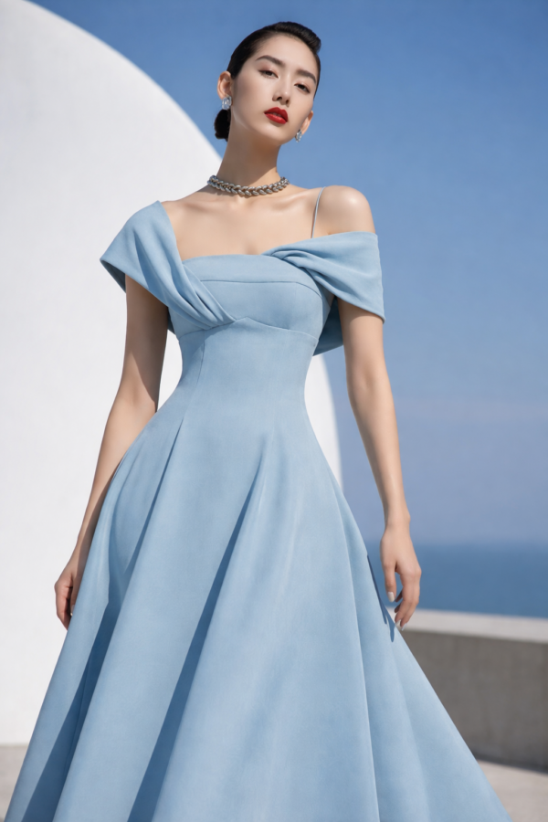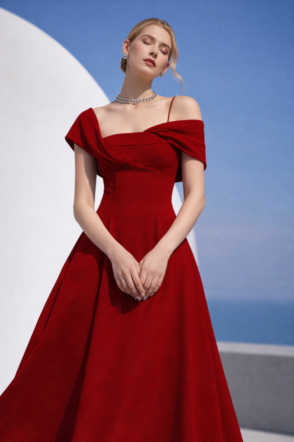 The Scarlet Structure Gown is designed for women who understand presence. Featuring an architectural off-the-shoulder neckline with sculpted draping, this silhouette frames the collarbone while defining the waist with precision tailoring.