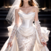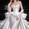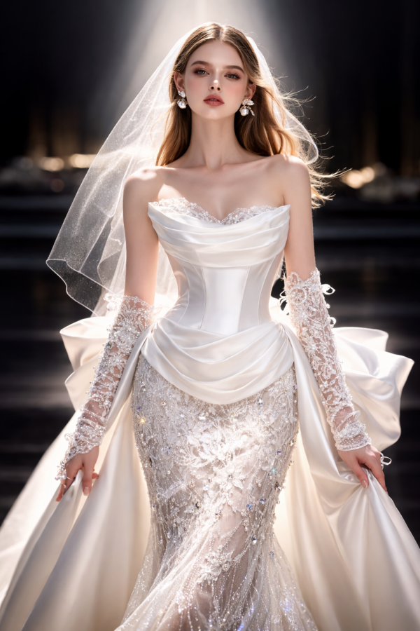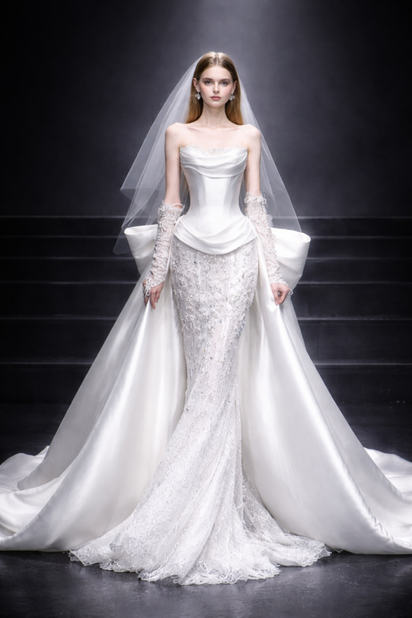 Thank you for reading this post, don't forget to subscribe!The Celeste Couture Gown is a statement of modern bridal power. Featuring a structured satin corset bodice with soft draped detailing, this silhouette sculpts the waist before flowing into a hand-embellished lace mermaid skirt that catches the light with subtle shimmer.