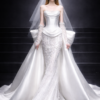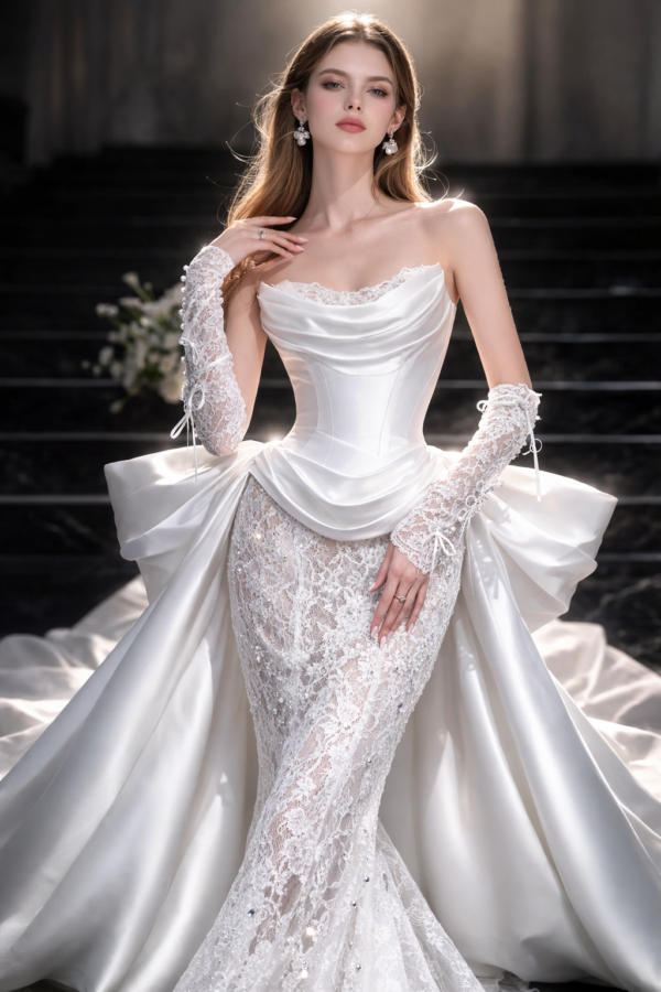 The detachable satin overskirt adds dramatic volume and ceremony presence, transforming the gown from fitted elegance to grand couture in a single movement. Delicate lace gloves and a soft veil complete the editorial vision.